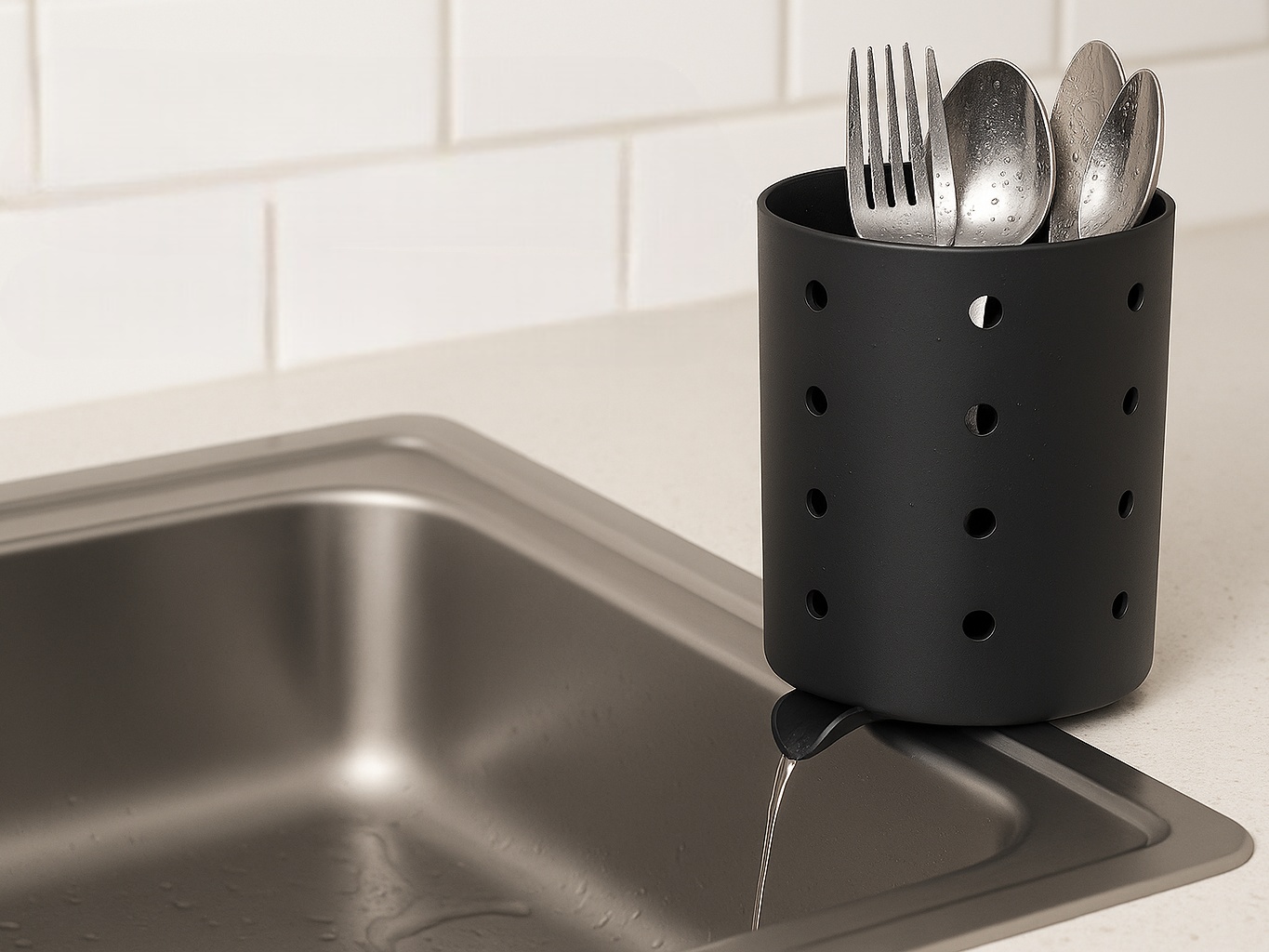 Držač pribora za jelo koji redefinišeodnos između funkcionalnosti i estetike. Pametno osmišljeni sistem integrisanog odvoda eliminiše nakupljanje vode – pribor se suši brzo i higijenski, direktno iznad sudopere. Vaša kuhinja ostaje uredna i suva bez ikakvih kompromisa. Cilindrični oblik u mat crnoj završnici donosi moderan karakter svakom kuhinsjkom prostoru. Perforacije raspoređene po celoj površini obezbeđuju optimalnu cirkulaciju vazduha. Odvodni kanal na dnu precizno usmerava vodu tamo gde pripada – u sudoperu, ne na radnu površinu. Svaki detalj je promišljen do savršenstva. Ovo je više od držača pribora – to je rešenje koje štedi vreme i čuva vaš radni prostor urednim svaki dan. Savršeno se uklapa uz minimalistički i industrijski stil enterijera. Izaberite proizvod koji spaja eleganciju sa svakodnevnom praktičnošću.
