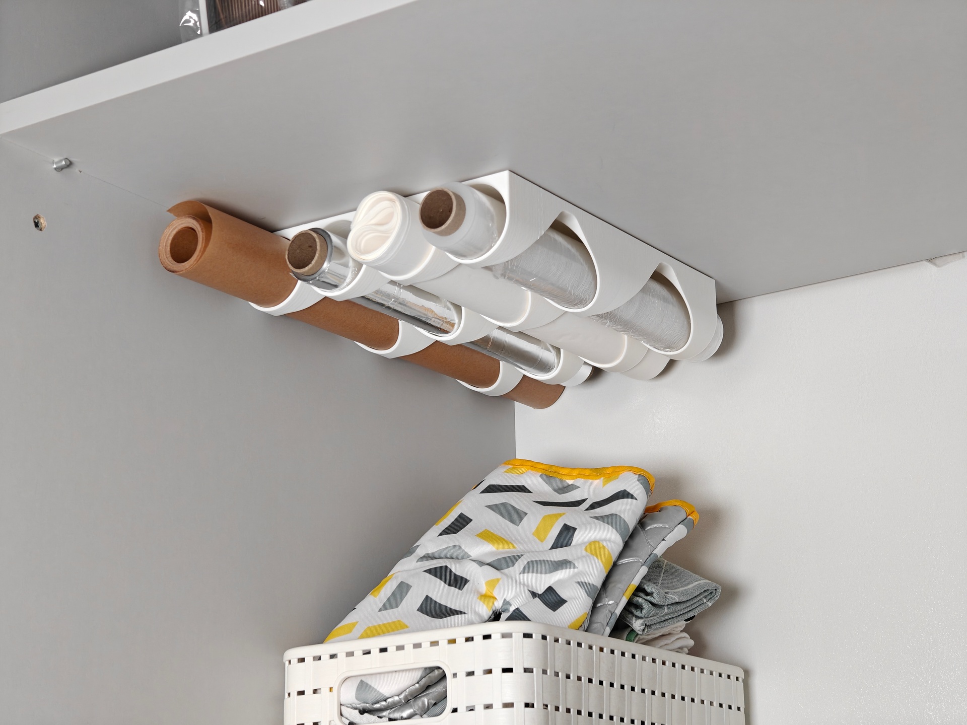 Organizacija kuhinje dobija novo značenje sa ovim pametnim rešenjem za skladištenje rolni. Držač se montira direktno ispod police ili ormarića, oslobađajući dragoceni prostor na radnoj površini. Višestruke cilindrične komore čuvaju sve rolne na jednom mestu – uvek dostupne, uvek uredne. Čist beli dizajn i zaobljene forme savršeno se uklapaju u moderan enterijер. Svaka komora bezbedno drži rolnu, sprečavajući prevrtanje i rasipanje. Papirni ubrus, folija, pek papir i stretch folija – sve staje na predviđeno mesto bez gužvanja i nereda. Montaža ispod police koristi prostor koji inače ostaje neiskorišćen. Ovo nije samo praktičan dodatak – to je promena navika. Kuhinja postaje funkcionalnija, a svakodnevne obaveze teku bez zastajanja i traženja po ormarima. Ulaganje u pravi sistem organizacije vraća se svakog dana u uštećenom vremenu i smirenoj atmosferi.