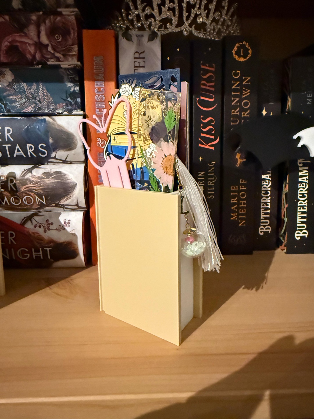 Elegancija koja spaja ljubav prema knjigama sa funkcionalnim dizajnom. Držač za obeleživače u obliku knjige savršeno organizuje vašu kolekciju i čini je lako dostupnom. Kremasta, neutralna boja naglašava minimalizam i uklapa se u svaki prostor - od radnog stola do police sa knjigama. Ovaj predmet imitira izgled prave knjige do najsitnijeg detalja. Otvorena gornja strana omogućava jednostavno postavljanje i vađenje obeleživača. Unutrašnjost je prostrana i prima više komada odjednom. Više od organizera - ovo je dekorativni detalj koji govori o vašem ukusu. Savršen poklon za strastvene čitaoce i ljubitelje knjiga. Postavite ga na vidljivo mesto i neka postane deo vaše čitalačke priče.