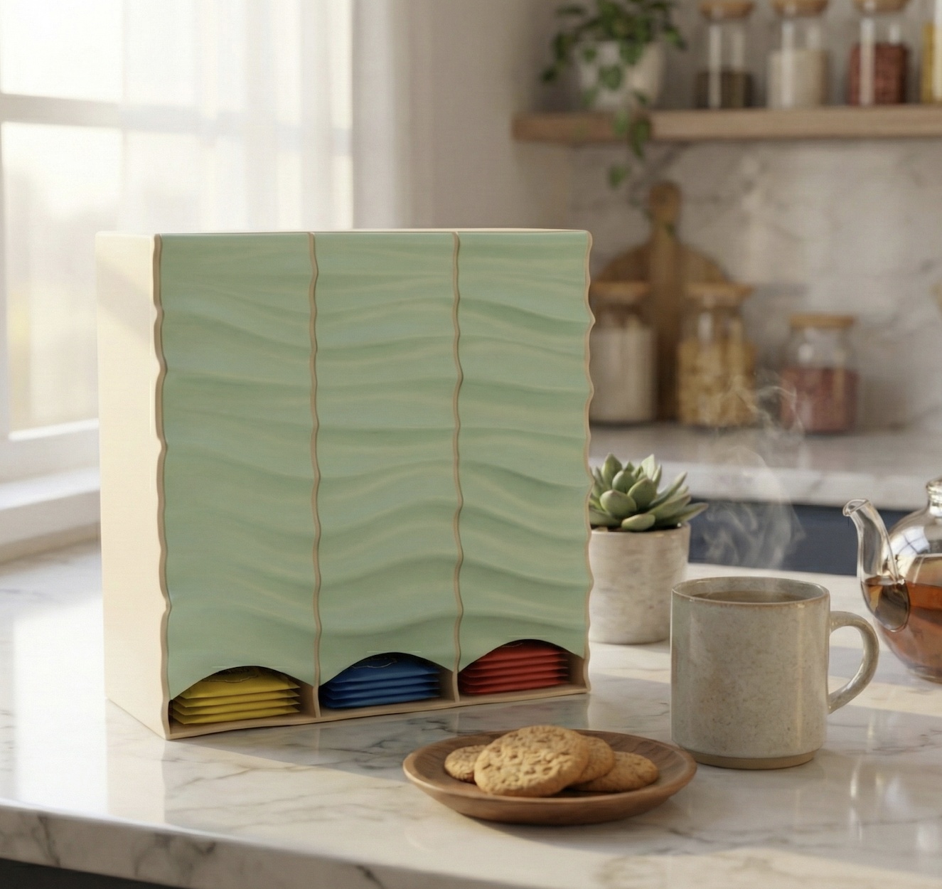 Ritual jutarnjeg čaja zaslužuje savršen red i elegantan ambijent. Organizer za kesice čaja Talas transformiše vaš kuhinjski pult u uređen, vizuelno privlačan prostor. Talasasti reljefni prednji panel stvara hipnotičan igru svetla i senke. Ovaj organizer postaje dekorativni akcent koji govori o vašem ukusu. Tri odvojena odeljka omogućavaju jasnu organizaciju različitih vrsta čaja. Kesice su uvek vidljive i lako dostupne — nema više preturanja po kutijama. Dostupan u više boja, uključujući nežno zelenu i nebesko plavu, savršeno se uklapa uz različite kuhinjske stilove. Kombinacija neutralnih bočnih strana i živopisnog prednjeg panela stvara sofisticirani kontrast koji osvežava svaki prostor. Više od organizatora — ovo je svakodnevni podsjetnik da lepota živi u detaljima. Idealan poklon za ljubitelje čaja ili elegantan dodatak vašem domu. Izaberite boju koja odražava vaš stil i unesite mir i red u svakodnevni ritual.
