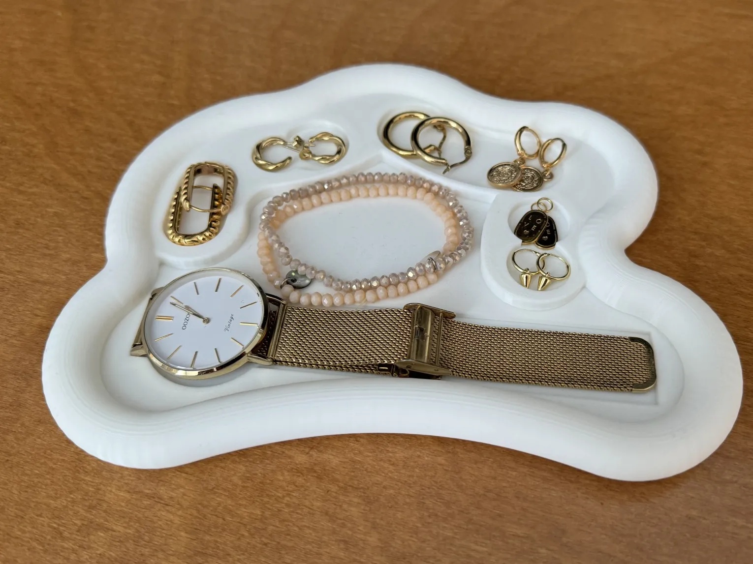 Tacna za Nakit Nilo je savršeni spoj funkcionalnosti i elegancije, dizajnirana da vašu kolekciju nakita prikaže u najboljem svetlu. Njena jedinstvena forma i sofisticirana bela boja čine je idealnim dodatkom svakom enterijeru, omogućavajući vam da organizujete i istaknete omiljene komade nakita na elegantan način. Izrađena od visokokvalitetnog materijala, ova tacna je dizajnirana da izdrži svakodnevnu upotrebu, dok njena glatka površina štiti vaše dragocenosti od ogrebotina. Njeni precizno oblikovani odeljci omogućavaju lako razvrstavanje prstenja, narukvica i minđuša, čineći vašu jutarnju rutinu jednostavnijom i bržom. Tacna za Nakit Nilo nije samo praktična, već i estetski privlačna, dodajući dašak luksuza vašem prostoru. Investirajte u Tacnu za Nakit Nilo i transformišite način na koji čuvate i izlažete svoj nakit. Ovo je više od običnog držača – to je umetničko delo koje unosi red i stil u vaš svakodnevni život. Idealna za ličnu upotrebu ili kao promišljen poklon za voljene osobe.